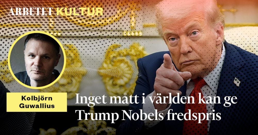 Jag skriver i Arbetet Kultur om varför Donald Trump inte är värd Nobels fredspris även om han får till ett avtal mellan Israel och Hamas, och varför det vore förödande för världen om han skulle få det. En stridslysten man med diktatorsambitioner ska inte blidkas av rädsla för hans vrede.