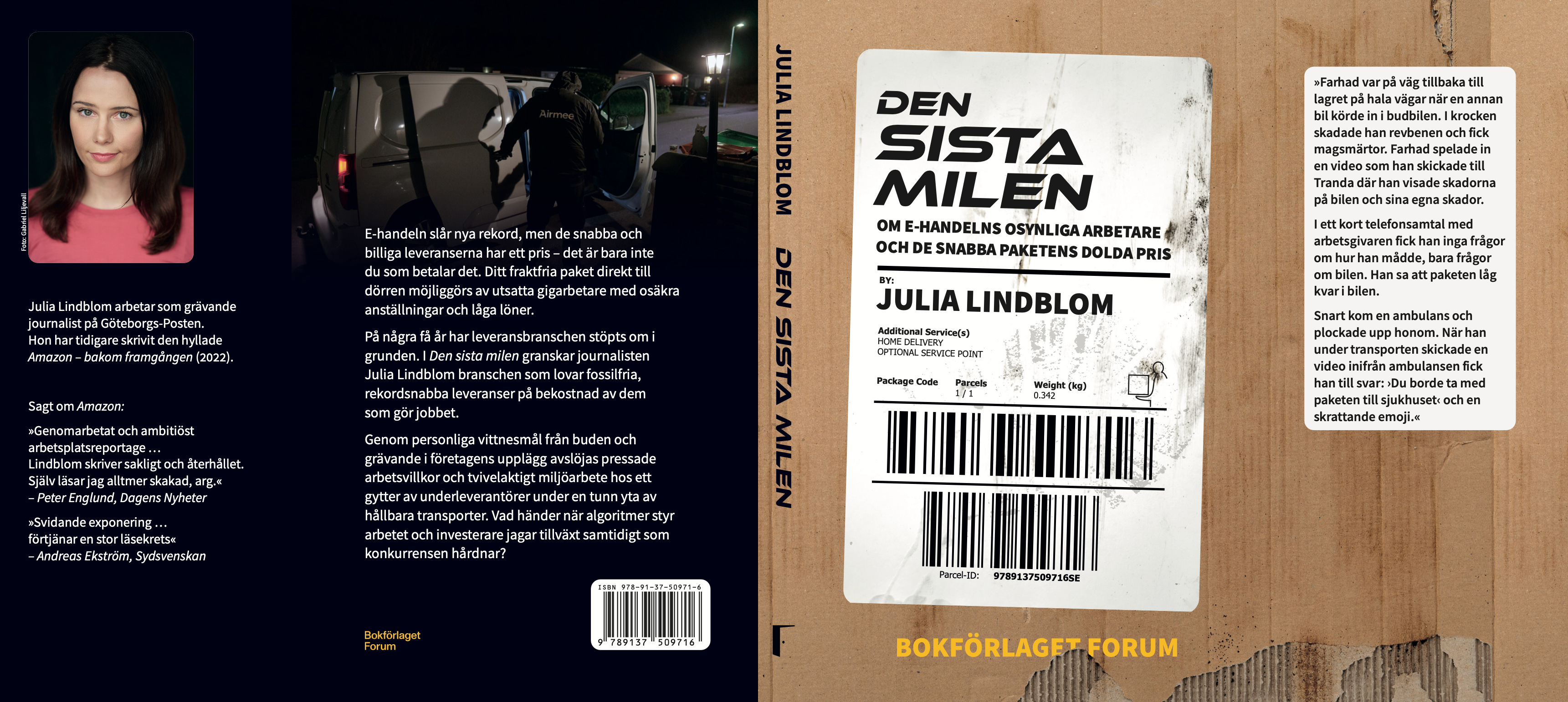 Jag har under början av hösten varit redaktör för Julia Lindbloms Den sista milen. Om e-handelns osynliga arbetare och de snabba paketens dolda pris som kommer ut på Bokförlaget Forum den 21 november.